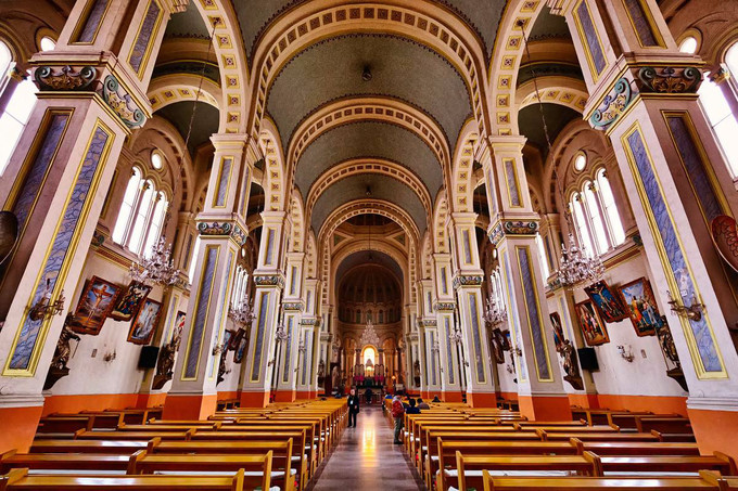 教堂外部用紅黃相間花磚砌成,三座呈品字形排列、高聳入云的塔樓上浮蓋著綠色銅片,塔樓頂上各有一個青銅十字架。走進教堂,映入眼簾的首先是湖藍(lán)、白色、淡黃構(gòu)成的內(nèi)部主色調(diào),給人一種清新的感覺,14根立柱從門口排列到祭臺。教堂四周列著一座座精美的教徒銅像,墻壁上則掛著一幅幅記述耶穌受難故事的油畫,教堂內(nèi)還有圣母、耶穌、天使等的彩色塑像。