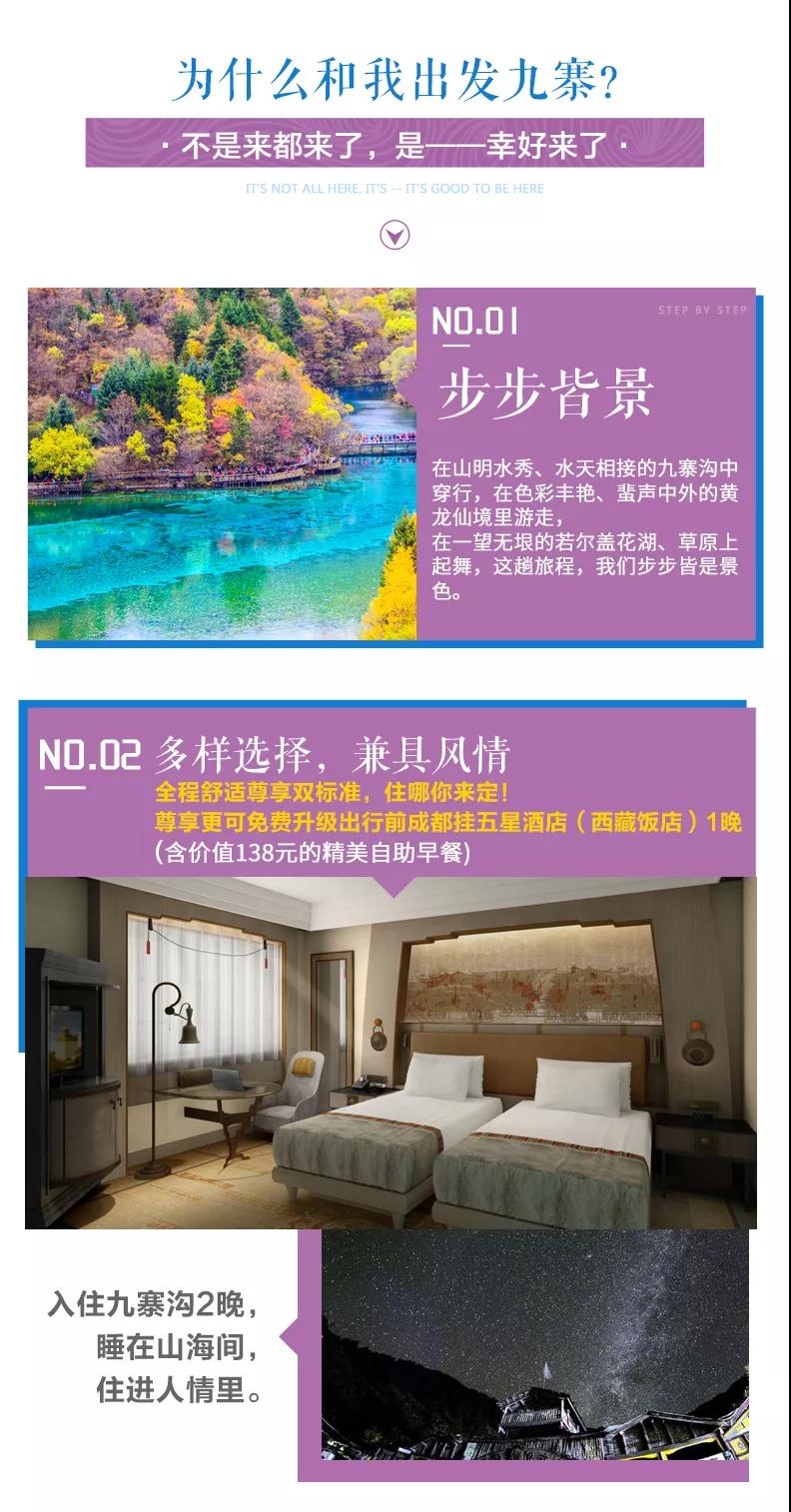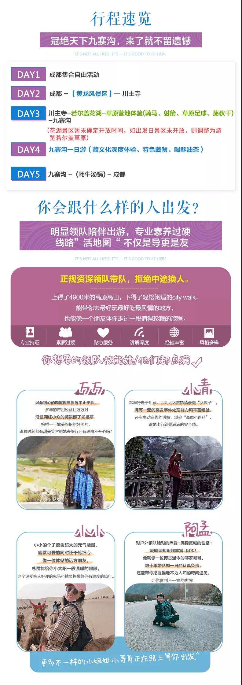 4、九寨溝景區(qū)實行分區(qū)域開放,開放區(qū)域為溝口經(jīng)諾日朗瀑布至長海,扎如溝的扎如寺及日則溝的鏡海;其中,長海、五彩池、鏡海、諾日朗瀑布、樹正群海、雙龍海瀑布、扎如寺等景觀原則上為步行游覽區(qū),具體游覽方式請聽從隨車講解員安排;