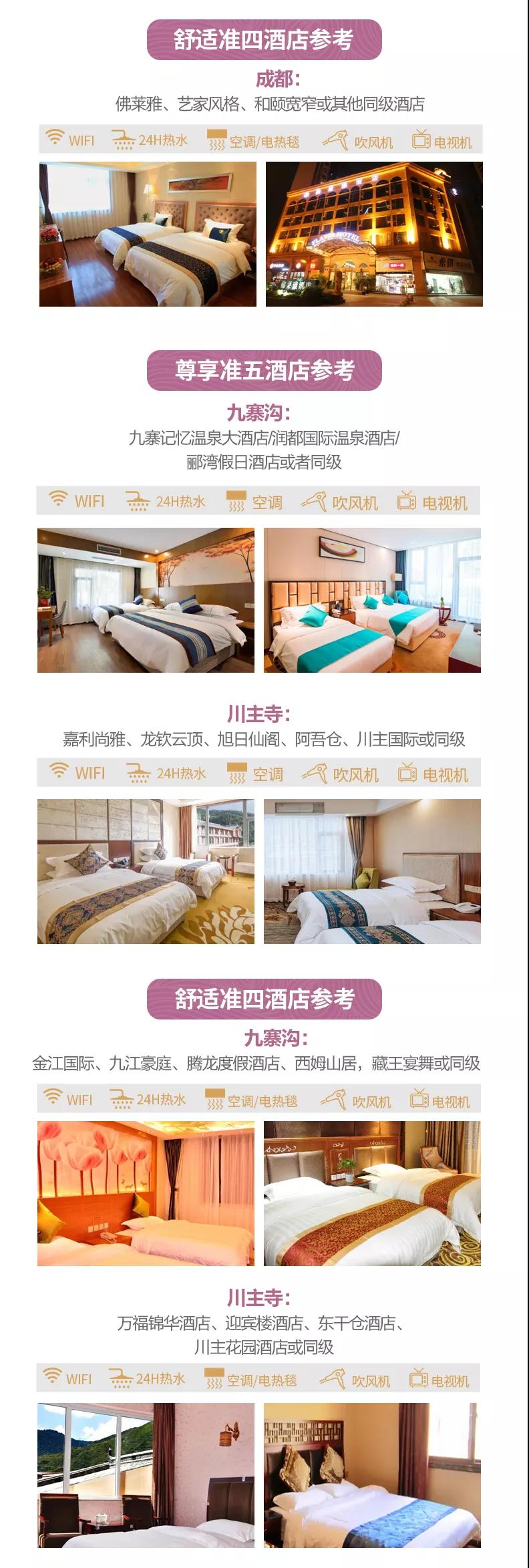 尊享準五:九寨記憶溫泉大酒店,潤都國際溫泉酒店,酈灣假日酒店或者同級酒店。