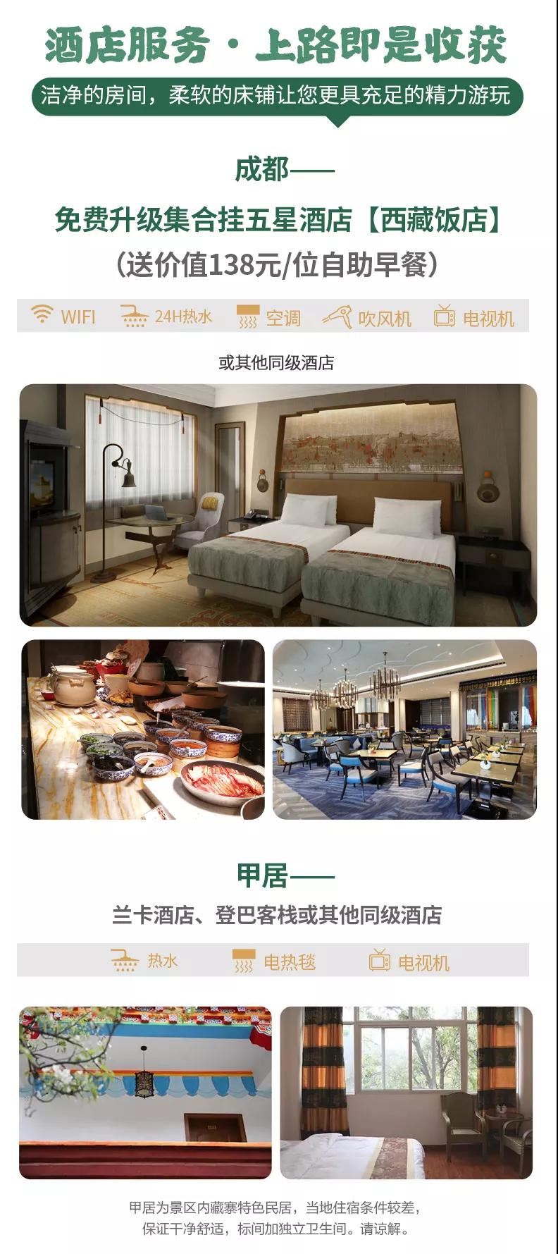 住宿:6晚當(dāng)?shù)鼐肪频觌p人標(biāo)間+免費升級一晚成都集合掛五酒店雙人標(biāo)間,確保酒店干凈衛(wèi)生,溫馨舒適。因沿途高原藏區(qū)條件有限,如果酒店設(shè)施沒有達到您的期望,敬請諒解。參考酒店如下: