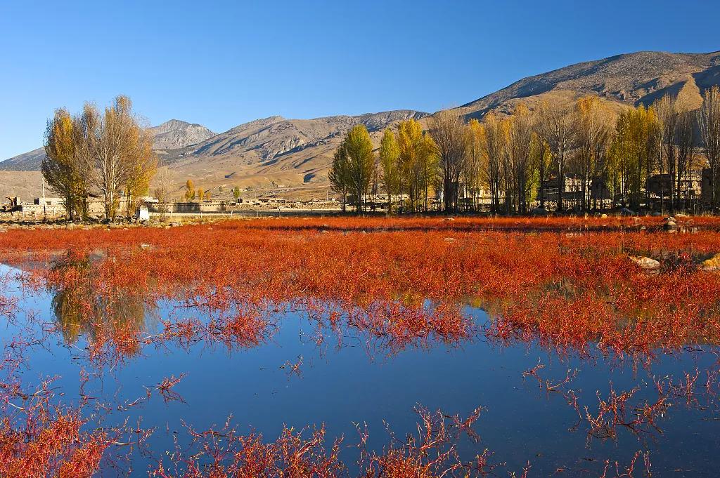 如果剛好遇到紅草季,我們將前往【桑堆紅草地】,欣賞那一抹浪漫的“高原紅”。生長在水中的紅草,大都疏密相間,像灌木枝扎根在水池中。這些紅草在陽光的照射下,紫里透紅,非常吸引眼球。遠處山腰斜坡上碩大的藏文六字真言,發(fā)散著一種雪域高原的神秘與莊嚴(yán)。