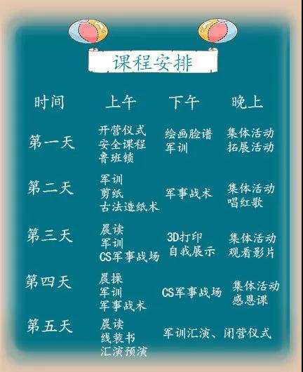 做一個屬于自己的臉譜·開啟自己的競賽模式體驗非遺文化剪紙藝術(shù)·享造紙之樂·觀看愛國主義電影·3D打印屬于你的傳奇·徒步探索自然·誦讀經(jīng)典·才藝表演·紙·cs真人挑戰(zhàn)·軍事對抗賽·感恩課·國學文化線裝書·草坪運動會·茶話會·軍事匯演及文藝展示·結(jié)營儀式·結(jié)業(yè)證書。