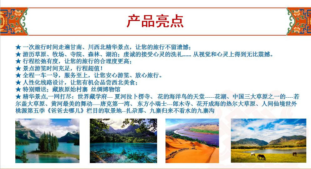 B 線寧夏中衛(wèi)(沙坡頭、金沙島)/內(nèi)蒙阿拉善旗(通湖草原)/青海西寧(青海湖)/甘肅蘭州(臨夏東公館、拉卜楞寺、??撇菰?、郎木寺、扎尕那石城、日拉米巴佛閣)四川阿壩藏族羌族自治州(九寨溝風(fēng)景區(qū)、藏式村寨、九曲黃河第一灣)空調(diào)專列12 日游