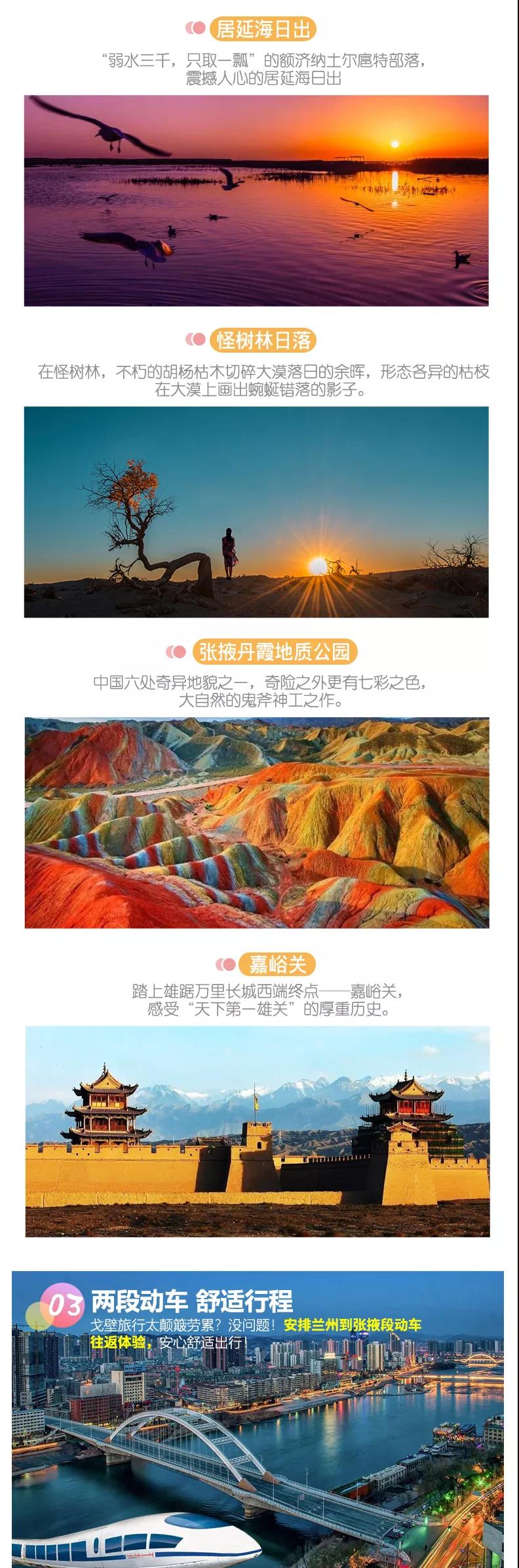 交通:當(dāng)?shù)芈糜伟褪浚ūWC一人一正座位,車型大小根據(jù)實(shí)際人數(shù)安排),且由駕駛經(jīng)驗(yàn)豐富的司機(jī)為您的出行保駕護(hù)航;蘭州到張掖、張掖到蘭州往返動(dòng)車費(fèi)用【參考車次D2748(12:22-16:49)、D2674 (13:05-17:41)、D2752 (13:31-17:58)、D56(15:03-19:45) 】。