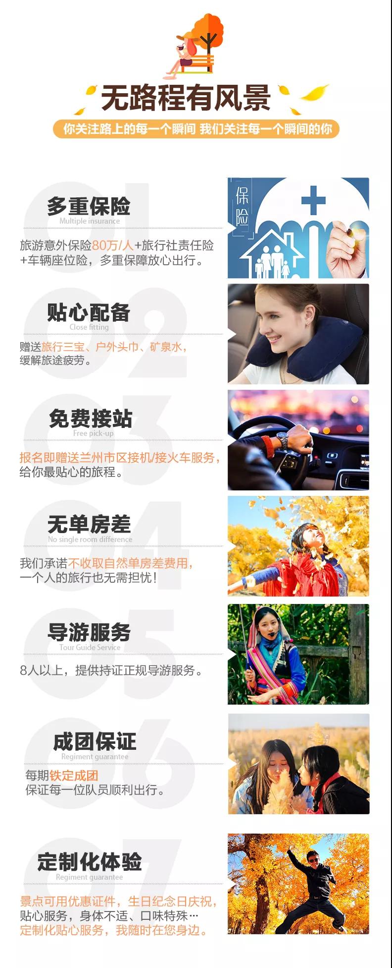 接站服務(wù):3人以下的客人抵達(dá)蘭州可自行打車前往指定酒店,打車費(fèi)用可報(bào)銷30元/人;3人及以上的客人抵達(dá)蘭州可提供蘭州市區(qū)拼車接機(jī)/接火車服務(wù),接機(jī)/接火車的工作人員會(huì)在您出發(fā)日期前一天21:30之前向您推送消息并與您聯(lián)系,如果超過時(shí)間沒有接到任何通知,請及時(shí)與導(dǎo)游或報(bào)名處聯(lián)系。(節(jié)假日用車人數(shù)較多情況下客人等待時(shí)間可能會(huì)延長;我方會(huì)安排臨近航班拼車接機(jī)接站,如遇其他客人航班火車延誤晚點(diǎn)情況,等待時(shí)間可能會(huì)延長,敬請諒解)