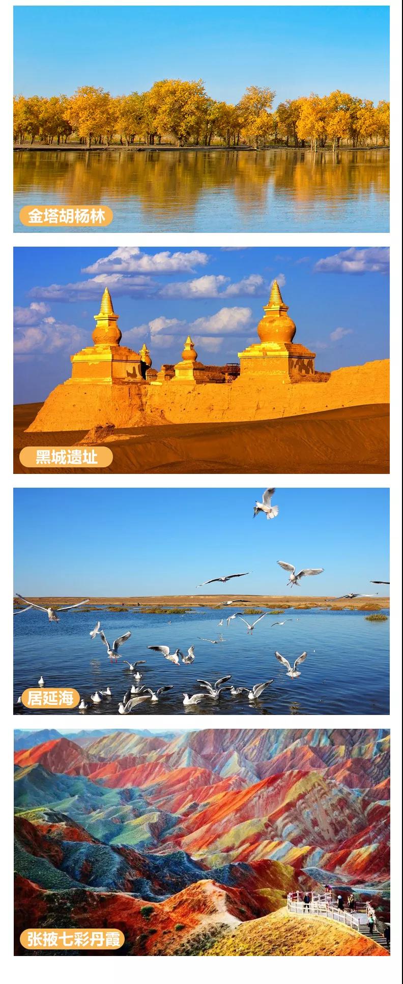 門票:含額濟(jì)納胡楊林、黑城-怪樹林-弱水胡楊林門票(含景區(qū)交通車)、居延海(含景區(qū)交通車)、張掖七彩丹霞地貌(含景區(qū)交通車)、嘉峪關(guān)城樓門票、策克口岸門票。