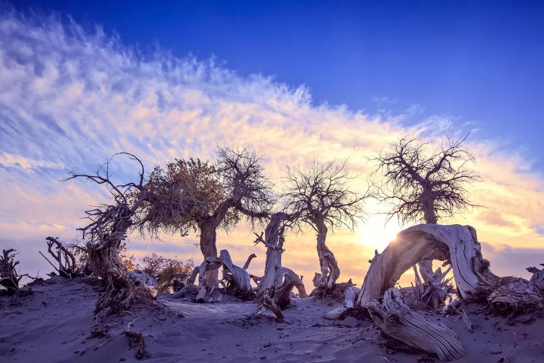 隨后我們游覽約一小時(shí)【怪樹林】,這里幾十年前是一片原始森林,由于水源不足等自然因素,大面積的胡楊樹木枯死。如今,枯木東倒西歪,神態(tài)各異,因此當(dāng)?shù)厝朔Q之為怪樹林。我們將在怪樹林欣賞大漠落日,看滾滾落日從地平線上姍姍落下,形態(tài)各異的枯枝在大漠上畫出蜿蜒的影子。
