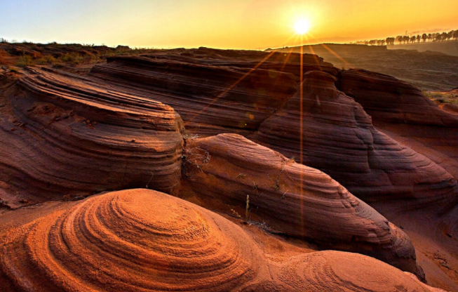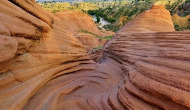 波浪谷展示的是由數(shù)百萬年的風、水和時間雕琢砂巖而成的奇妙世界。層層疊疊的石頭就像一大批鋪蓋在地面上浸染過后晾曬的紅色布匹,一層層、一卷卷、一盤盤在夕陽的渲染之下,異常的鮮紅; 與溝底一處處流淌細小的河水和遠處覆滿綠色植被山頂上轉(zhuǎn)動的風車構(gòu)成了一幅優(yōu)美的實景畫。