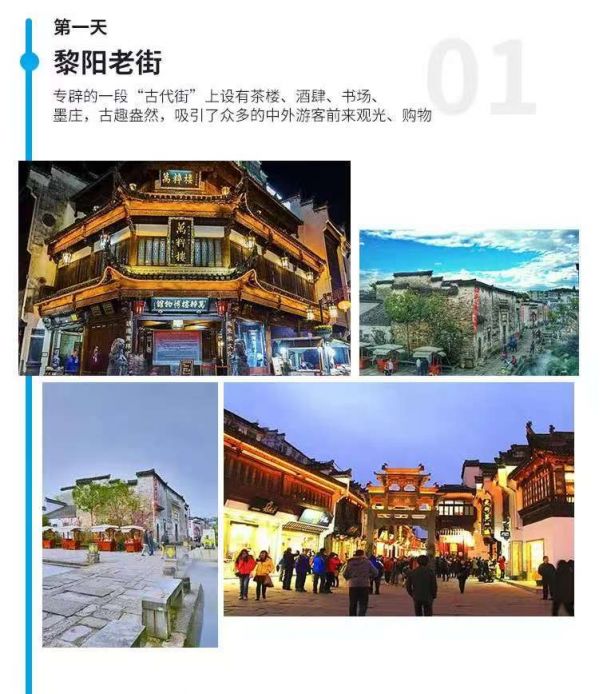 到達(dá)黃山市后自由逛黎陽(yáng)老街:今黃山市屯溪區(qū)黎陽(yáng)鎮(zhèn)的舊時(shí)街市,與屯溪老街隔江相望。屯溪老大橋(原名鎮(zhèn)海橋)作為他們之間的唯一通道橫跨其間。老大橋往南,走過一座橫跨在名為河底溪的小溪上的西鎮(zhèn)橋就是黎陽(yáng)老街。大部分舊宅不復(fù)存在,但依然留下了具有徽州傳統(tǒng)風(fēng)格的徽派民居數(shù)座及民國(guó)石庫(kù)門風(fēng)格的老宅。 老屯溪人代代相傳的俗語(yǔ)“明清個(gè)屯溪,唐宋個(gè)黎陽(yáng)”,它隱隱地告訴了我們黎陽(yáng)在昱城人心中的分量。
