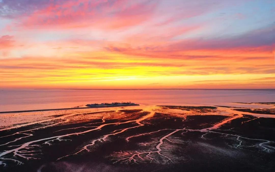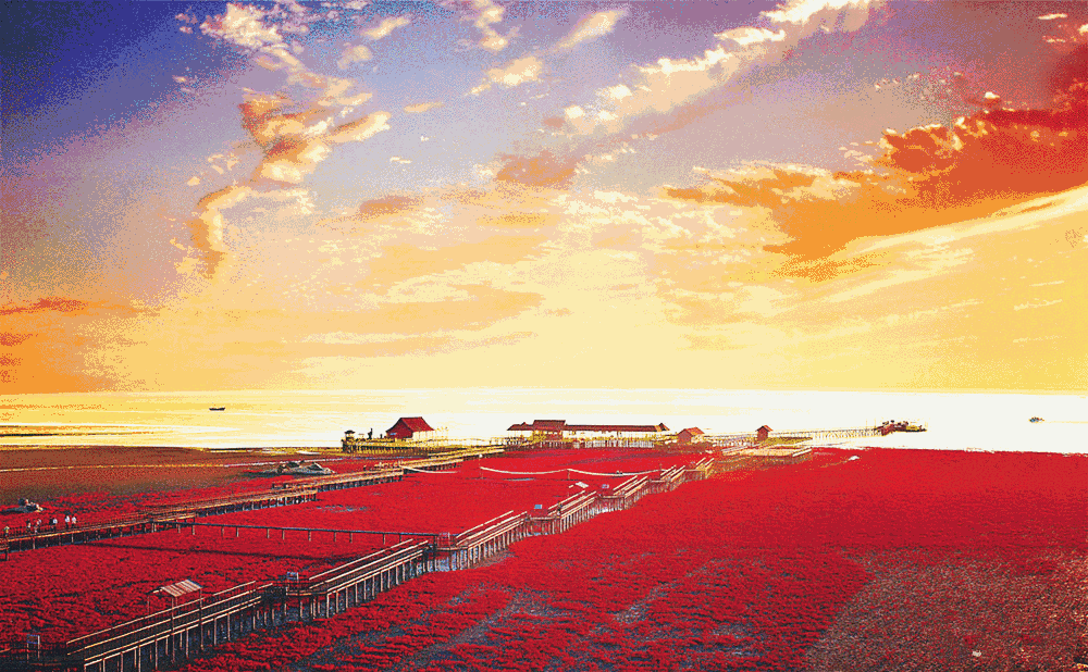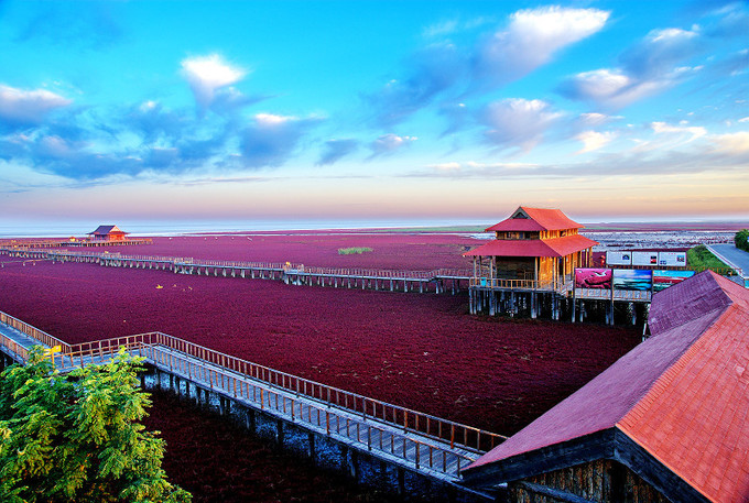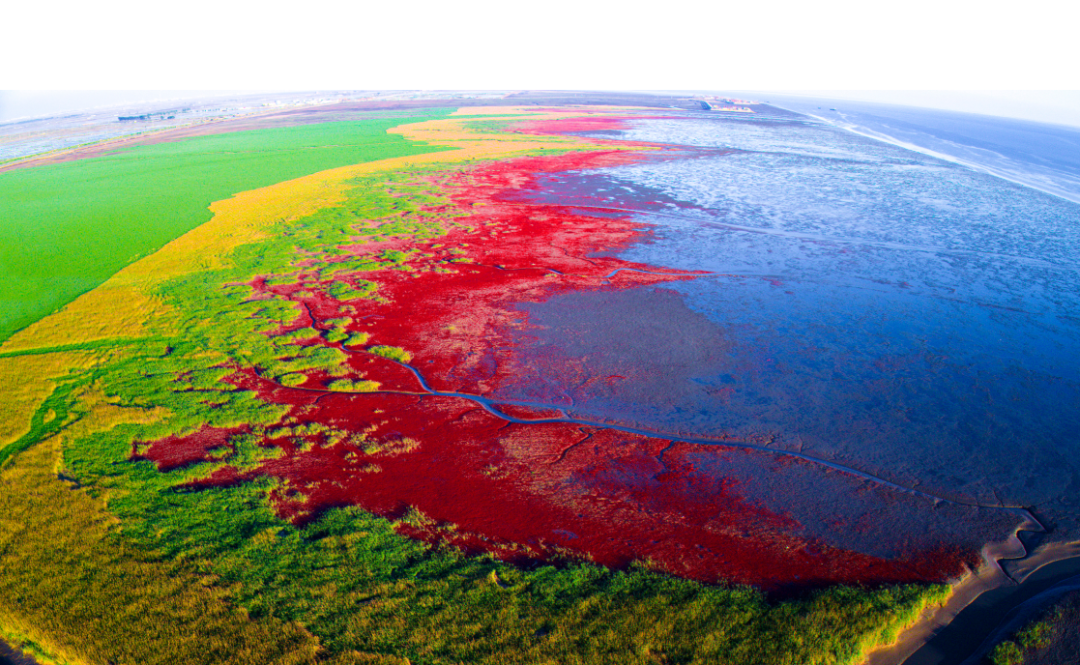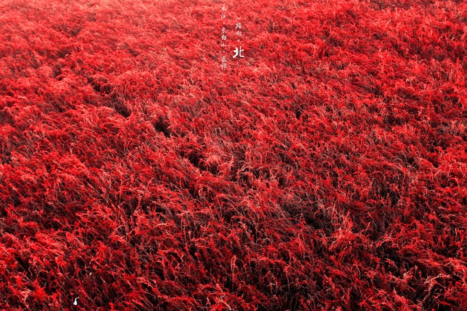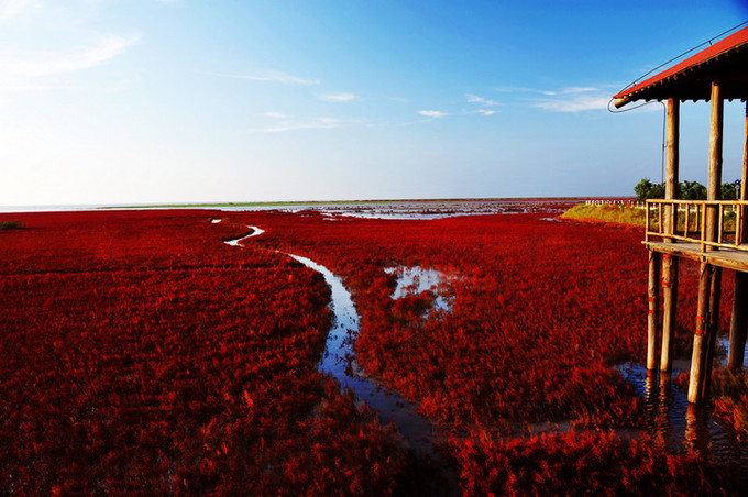 紅海灘位于遼寧省盤錦市渤海灣的東北部,地處遼河三角洲濕地內(nèi),是國家級自然保護區(qū)。這里的海灘之所以呈現(xiàn)出紅色,其實是因為海灘上生長堿蓬草是一種可以在鹽堿土質(zhì)上存活的草。每年四月,堿蓬草長出地面,初為嫩紅,漸次轉(zhuǎn)深,秋季由紅變紫。堿蓬草不要撒種,無須耕耘,在鹽堿鹵漬里,年復(fù)一年地生長,造就了這一奇觀。盤錦的紅海灘每年以50米的速度向大海延伸,始終追趕著海浪的蹤跡。