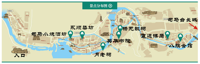 半日游安排(下午半天游覽 賞夜景):景區(qū)大門-雁歸游船碼頭-湯市街-司馬小燒酒坊-司馬缸酒樓-永順染坊-皮影戲館剪紙店-英華書院-楊無敵祠-水鎮(zhèn)美食街-湯河賽橋-龍鳳池溫泉-鎮(zhèn)遠鏢局-八旗會館-音樂噴泉
