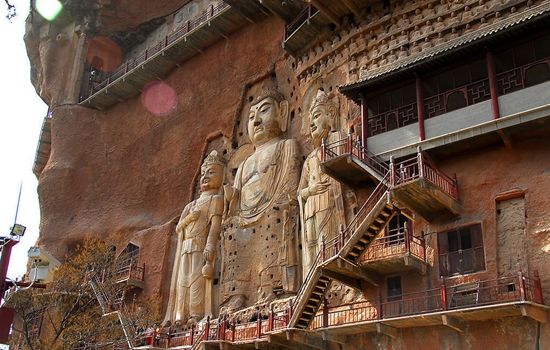 麥積山石窟屬全國重點文物保護單位,建自公元384年,后來經(jīng)過十多個朝代的不斷開鑿、重修,遂成為我國著名的大型石窟之一,也是聞名世界的藝術(shù)寶庫。麥積山石質(zhì)皆為紫褐色之水成巖,其山勢陡然起獨峰,最初有許多天然之巖洞。它的海拔1742米,山頂距地面142米,現(xiàn)存洞窟194個,其中有從4世紀到19世紀以來的歷代泥塑、石雕7200余件,壁畫1300多平方米。由于麥積山山體為第三紀沙礫巖,石質(zhì)結(jié)構(gòu)松散,不易精雕細鏤,故以精美的泥塑著稱于世,絕大部分泥塑彩妝。被雕塑家劉開渠譽為“東方雕塑陳列館”。它的開鑿年代,大部分學者認為始于后秦,歷經(jīng)北魏、西魏、北周、隋、唐、五代、宋、元、明、清歷代都有不斷地開鑿和修繕,現(xiàn)存造像中以北朝造像原作居多。麥積山石窟的一個顯著特點是洞窟所處位置極其驚險,大都開鑿在懸崖峭壁之上,洞窟之間全靠架設(shè)在崖面上的凌空棧道通達。游人攀登上這些蜿蜒曲折的凌空棧道,不禁驚心動魄。古人曾稱贊這些工程:“峭壁之間,鐫石成佛,萬龕千窟。碎自人力,疑是神功?!备浇罕娭羞€流傳著“砍完南山柴,修起麥積崖”,“先有萬丈柴,后有麥積崖”的諺語??梢姰敃r開鑿洞窟,修建棧道工程之艱巨、宏大。