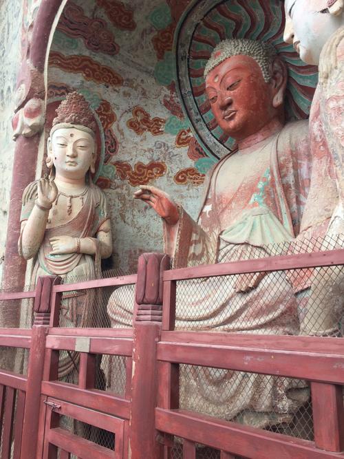麥積山的洞窟很多修成別具一格的“崖閣”。在東崖泥塑大佛頭上15米高處的七佛閣,是我國典型的漢式崖閣建筑,建在離地面50米以上的峭壁上,開鑿于公元6世紀中葉。麥積山石窟雖以泥塑為主,但也有一定數(shù)量的石雕和壁畫。麥積山石窟被列為國家重點文物保護單位,新架和修復了1300多米的凌空棧道,使游人能順利登臨所有洞窟。麥積山石窟的造像最高大者達16米,最小者僅為10余厘米。其中第44窟造像被日本人稱為“東方的維納斯”。西秦的78窟 、128窟的造像的僧衣細致地繪出了圖案。建于七十余米高的的七佛閣上塑像俊秀,過道頂上殘存的壁畫精美絕倫,其中西端頂部的車馬行人圖,無論從哪個角度看車馬所走方向均不相同,堪稱國內(nèi)壁畫構(gòu)圖之經(jīng)典之作。