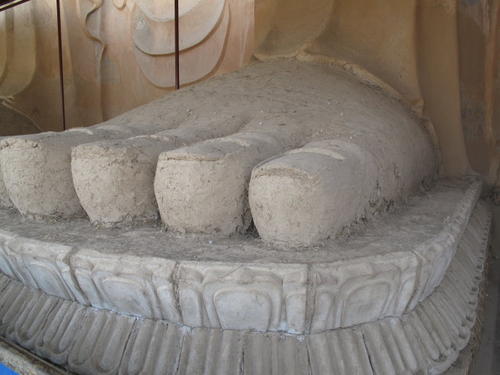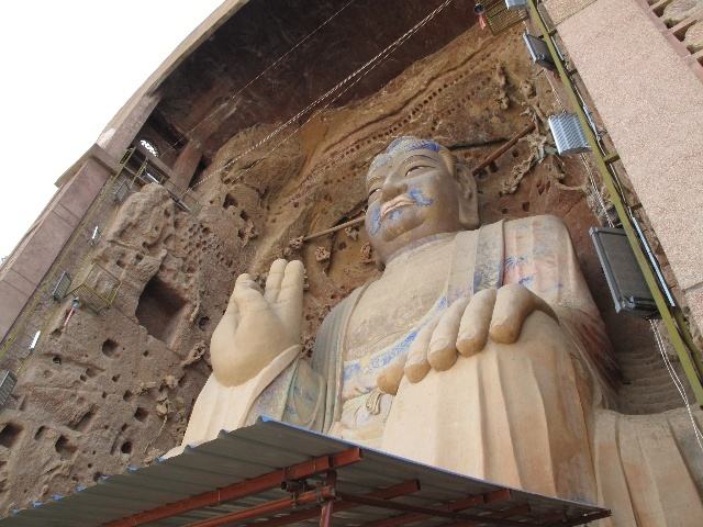 甘谷大佛石窟造象可遠溯至北魏,具體年代已經(jīng)無從稽考?,F(xiàn)存釋迦牟尼大佛像始鑿于北魏,一直到盛唐才趨完美。大佛石胎泥塑,身高23.3米,腰闊10.4米,結(jié)跏跌坐于蓮座之上,高大魁梧,溫順善良,坐于30.2米高、窟頂呈圓拱形的石窟內(nèi),頤面豐滿,肉髻高突,兩耳下垂,頸短并飾三道弦紋,短須作蝌蚪狀,施拔濟眾生印,足踩豐蓮??邇?nèi)還殘存懸塑達摩、頻伽、飛天、卷云、蓮葉等,栩栩如生。