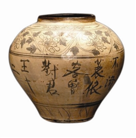 磁州窯還大量題寫詩文做器物的裝飾,這種裝飾風(fēng)格最初始于唐代長沙窯,而磁州窯得到進(jìn)一步的發(fā)展和完善,其書寫方法無一定規(guī)格,非常隨意。