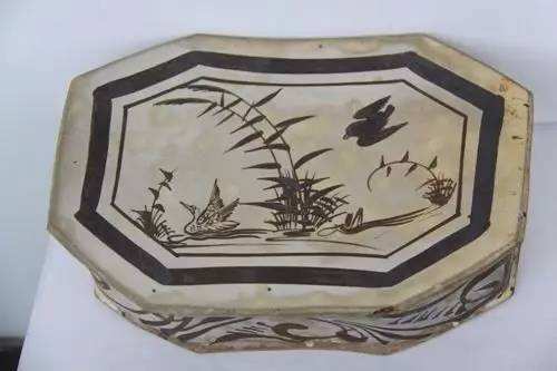 在裝飾上主要采用黑白對比的方法,其中以畫花、剔花及珍珠地最為盛行。畫花系以當(dāng)?shù)厮a(chǎn)的花斑石為繪料,在白色的釉地上畫出黑色的花紋,其紋飾多以枝葉并茂的折枝花和生動多姿的魚間窯以獨(dú)特的創(chuàng)造性,一改宋代以前我國南青北白的單色裝飾方式,開創(chuàng)白地黑花釉下彩繪陶瓷制品的裝飾先河。