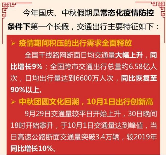“2020年國慶節(jié)、中秋節(jié)八天,全國共接待國內(nèi)游客6.37億人次,按可比口徑同比恢復(fù)79.0%;實現(xiàn)國內(nèi)旅游收入4665.6億元,按可比口徑同比恢復(fù)69.9%?!?