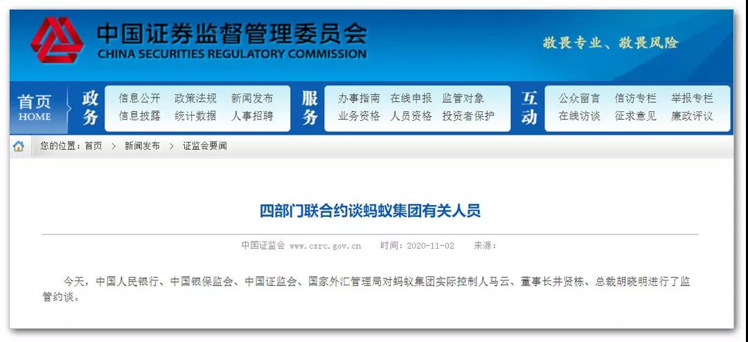 11月2日,中國(guó)人民銀行、中國(guó)銀保監(jiān)會(huì)、中國(guó)證監(jiān)會(huì)、國(guó)家外匯管理局齊聚一堂,約談螞蟻金服實(shí)際控制人馬云、董事長(zhǎng)井賢棟。