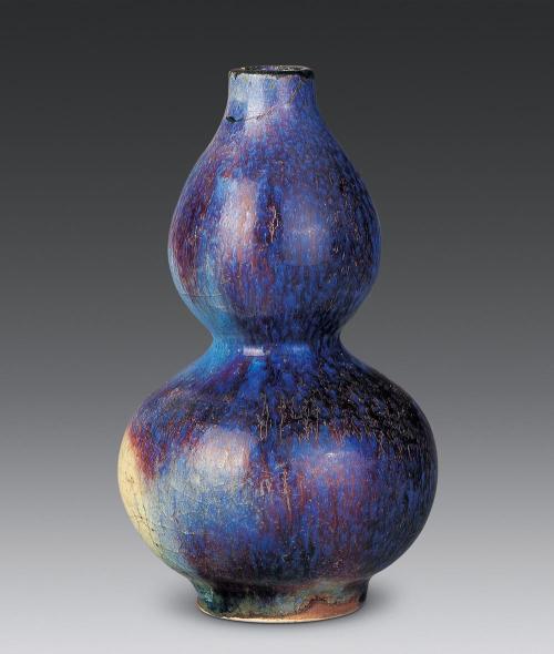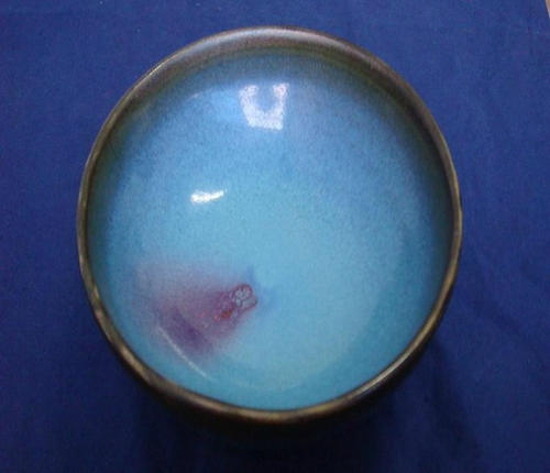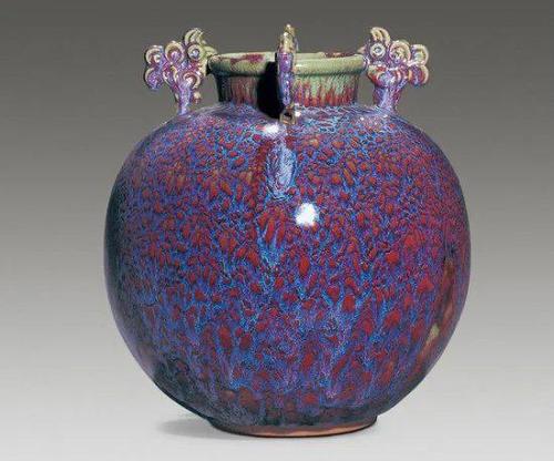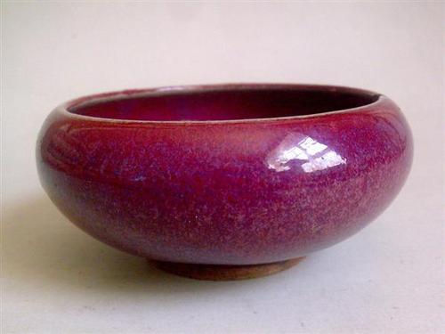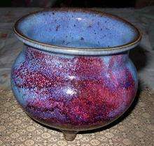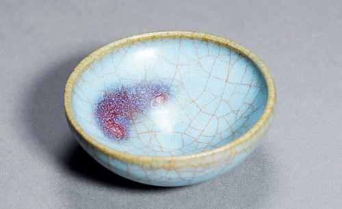 鈞釉的紅色是由于還原銅的呈色作用。紅釉中含有0.1~0.3%的CuO(氧化銅),還含有一定數(shù)量的 SnO2(二氧化錫)。在天藍、天青和月白色釉中,CuO含量極低,只有0.001~0.002%,和一般白釉中的含量相近,鈞釉的紫色是由于紅釉與藍釉互相熔合的結(jié)果,鈞瓷的紫斑是由于在青藍色的釉上有意涂上一層銅紅釉所造成的。