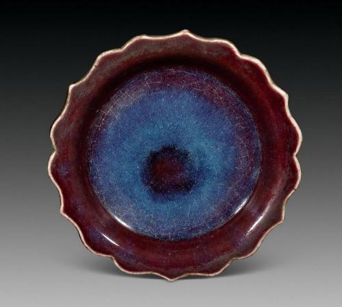明張應(yīng)文撰《清秘藏》“均州窯,紅若臙脂者為最,青若蔥翠色、紫若墨色者次之。色純而底有一二數(shù)目字號者佳,其雜色者無足取,均之釉無論深淺濃淡皆混然一律,元瓷之釉濃處有時或起條文,淺處有時仍見水浪”