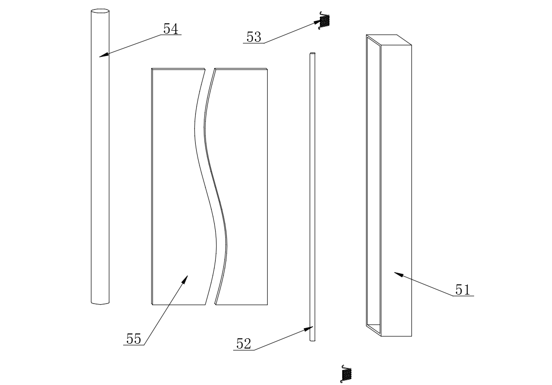 所述拓展展示件5包括收聚盒51,所述收聚盒51內(nèi)部設有主體桿52,所述主體桿52兩端均與收聚盒51內(nèi)壁之間轉(zhuǎn)動連接,所述主體桿52兩端與收聚盒51內(nèi)壁之間設有轉(zhuǎn)向扭簧53,所述轉(zhuǎn)向扭簧53兩端分別主體桿52和收聚盒51內(nèi)壁固定連接,所述主體桿52一側(cè)設有手持桿54,所述手持桿54與主體桿52之間設有拓展卷55,所述拓展卷55兩端分別與手持桿54和主體桿52固定連接;