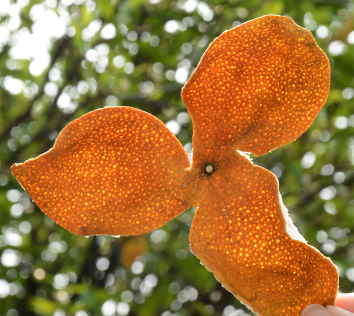 2、廣陳皮:常3瓣相連,形狀整齊,厚度均勻,約1mm,點(diǎn)狀油室較大,對光照視,透明清晰。質(zhì)較柔軟。