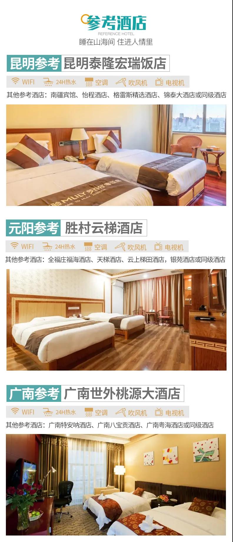 住宿 :行程所列7晚當(dāng)?shù)鼐频陿?biāo)間,并贈送集合日昆明四星酒店一晚。元陽景區(qū)酒店標(biāo)間2晚、廣南準(zhǔn)四酒店1晚、彌勒準(zhǔn)四星酒店標(biāo)間1晚、羅平縣三星酒店1晚、普者黑景區(qū)精品客?;蚓频?晚(景區(qū)內(nèi)住宿均為攝影農(nóng)家客棧標(biāo)準(zhǔn)間,不帶星級;因沿途條件有限,如酒店設(shè)施達(dá)不到您的期望,請您諒解)