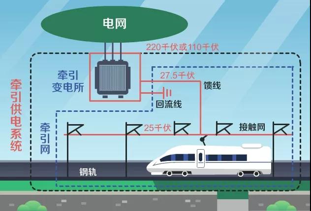 另外,高鐵用電和家庭用電不同。家庭用電的電壓等級(jí)一般是220伏,而高鐵用電雖同為單相電壓,但電壓等級(jí)卻高達(dá)25(27.5)千伏。這種單相、25(27.5)千伏的交流電是由牽引變電所將電網(wǎng)輸?shù)碾娹D(zhuǎn)變而來。