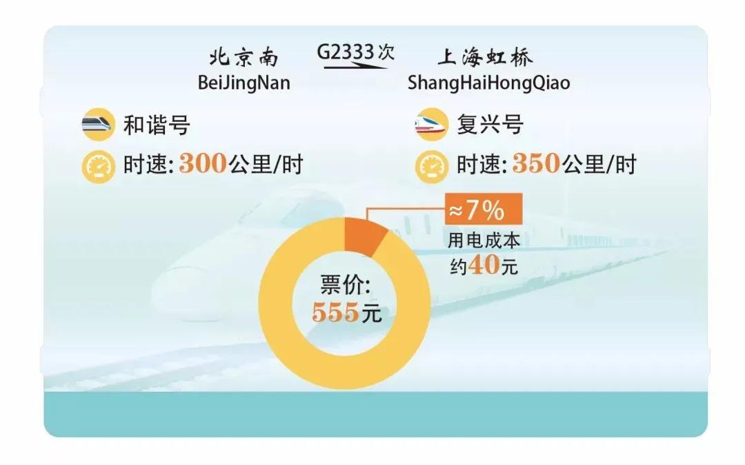 我們來看個(gè)實(shí)例。以京滬高鐵為例,據(jù)新華社報(bào)道,和諧號(hào)動(dòng)車組時(shí)速300公里時(shí),人均百公里耗電量為3.64度、單趟全程總耗電量約48度。據(jù)《科技日?qǐng)?bào)》報(bào)道,時(shí)速350公里運(yùn)行的復(fù)興號(hào)動(dòng)車組人均百公里能耗僅3.8度電,單趟全程總耗電量約50度。按照目前高鐵享受的優(yōu)惠電價(jià)算,用電成本約40元,為京滬高鐵全程二等座票價(jià)555元的7%左右。