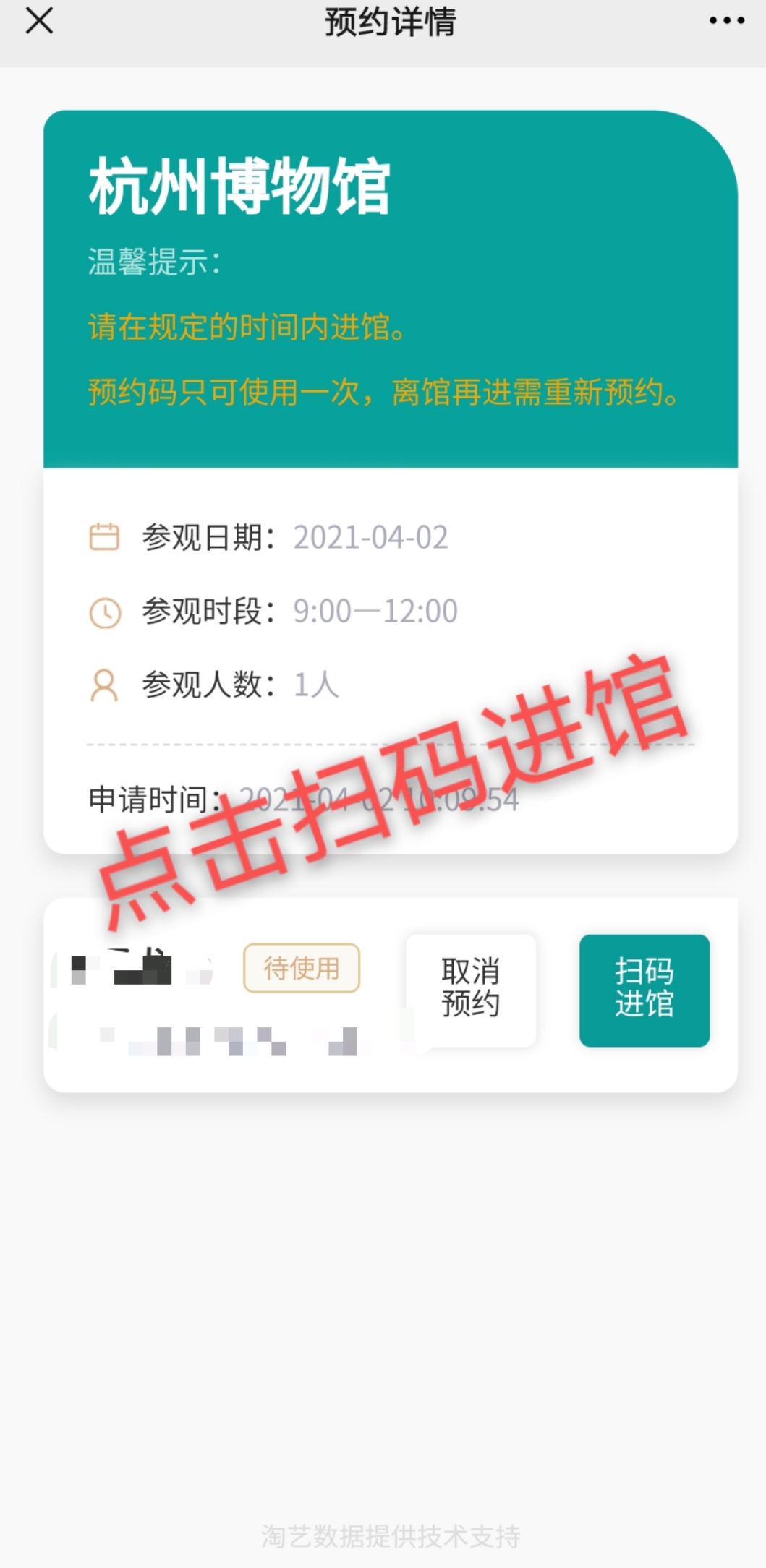2. 每張有效身份證件每個時段限約1次,每次可預約5人。請務必截屏保存預約二維碼(也可通過微信預約界面進入個人->我的預約->查看獲取預約二維碼 )。觀眾到館后通過刷二維碼或預約的身份證過閘檢票進館。