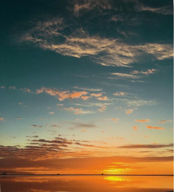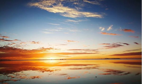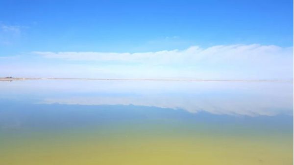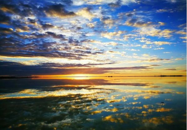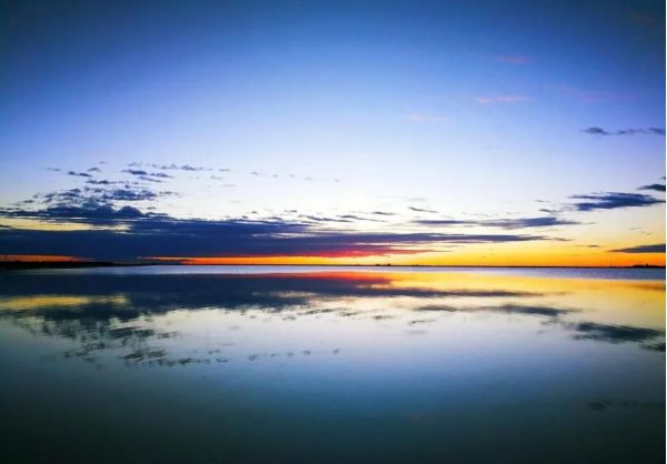平靜的湖面,水天一色,遠處的白云像是海水的浪花,一層層逐漸向你涌來。