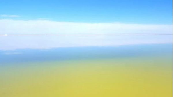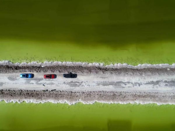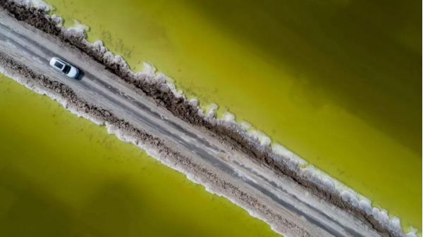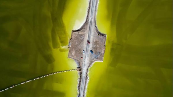 這座“鹽橋”,旁無護欄,下無橋墩,也無流水,從空中看,就像是直接橫叉在湖面上,它將鹽湖從中間劈成兩半,似乎沿著這條路走下去,就能達到神仙的住所。