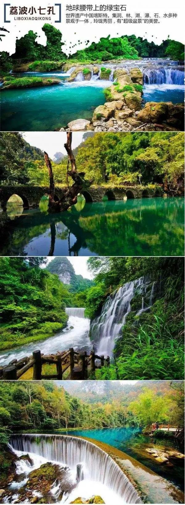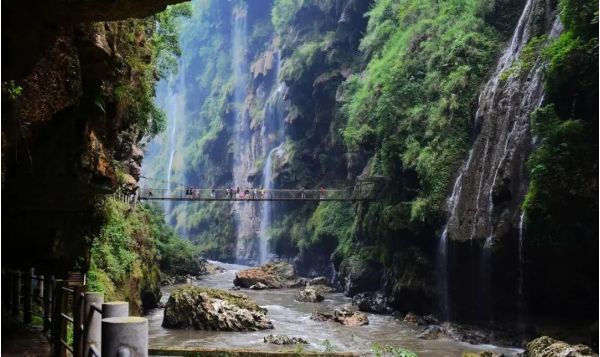 下午:后乘車前往游覽國(guó)家 AAAAA 級(jí)景區(qū)【大七孔】 (游玩時(shí)間不少于 2 小時(shí));大七孔是以原始森林、峽谷、 伏流、地下湖為主體的景區(qū),沿著恐怖峽打狗河直下,可見吊橋,右邊的棧道一面靠山,一邊臨水,蜿蜒曲折,凹凸不 平。最為震撼的還是走過(guò)棧道的三分之二處,有一橫跨河兩岸的天然巨巖,是喀斯特是貌奇觀之一,俗稱天生橋,被專 家們譽(yù)為 “大自然神力所塑的東方凱旋門”,仰觀橋孔下,只見巨型鐘乳懸掛,橋腳、橋側(cè)的裂隙石縫長(zhǎng)出綠石草叢灌木,藤蘿花卉纏裹橋身,真是滿目琳瑯、五顏六色的天然大彩橋。