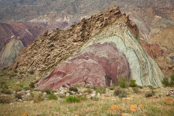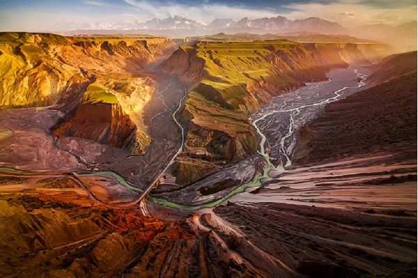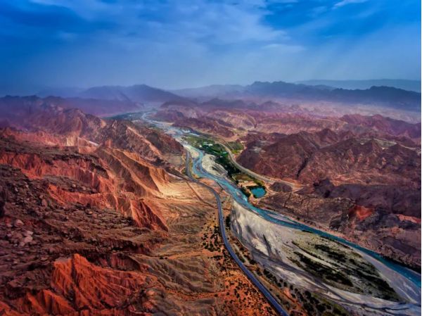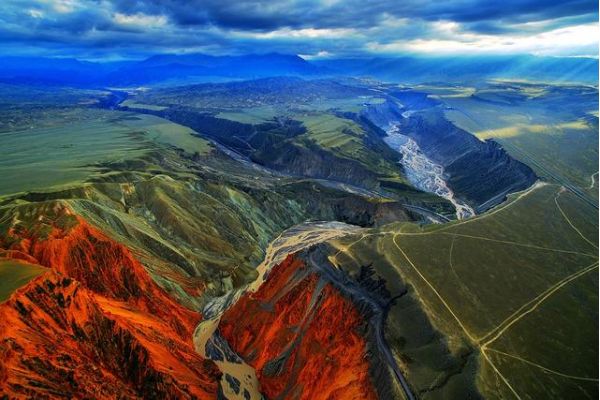 安集海河發(fā)源于天山山脈,通過長年沖刷,在通古特附近沖出天山峽谷,在天山北坡下形成了規(guī)模宏大的沖擊扇,河谷沖擊扇規(guī)模宏大,以傘形向北張開,甚稱地質奇觀。此處非景點,本地人知道也不多,幾乎無游人,拍攝危險系數較大,站在山頂往谷底看,背脊發(fā)涼。