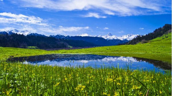 唐布拉草原得名于阿吾拉勒山北坡唐布拉溝東側有幾處突兀的巖石,因巖石酷似玉璽、印章而得名。唐布拉草原意即"印章"。唐布拉草原景點眾多,據說有113條溝,每條溝都有各自的特色。流泉瀑、溪水淙淙;奇特的阿爾斯郎石林,壯觀的草原落日;冰峰雪嶺倒映在靜寂幽深的高山湖泊之中。溫熱清爽的溫泉,藍藍的天,綠茵茵的草坂,每時每刻給人以美的享受。