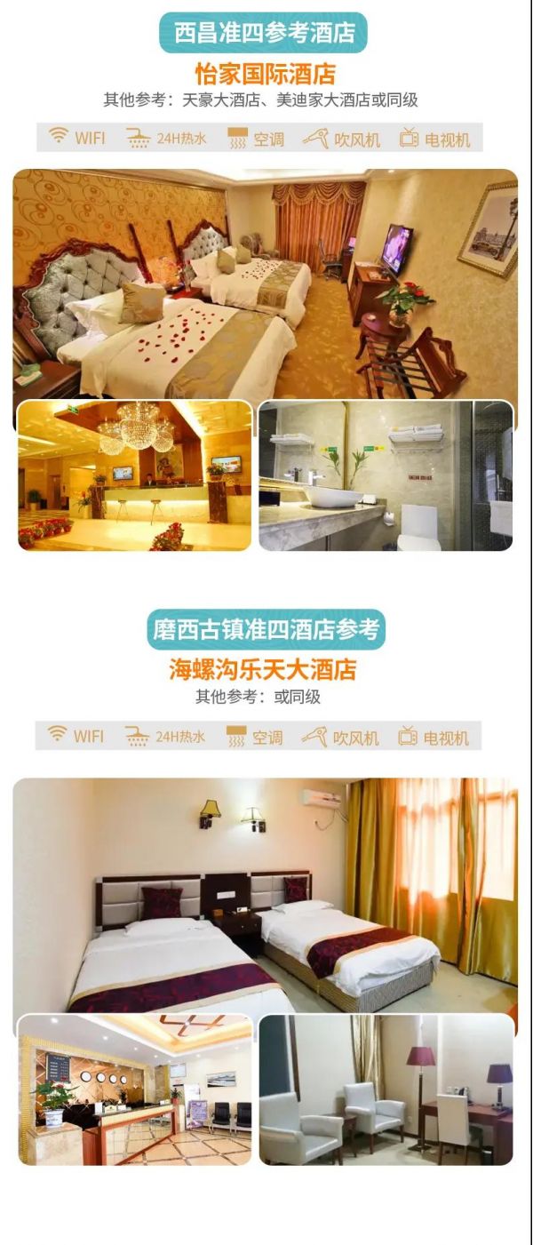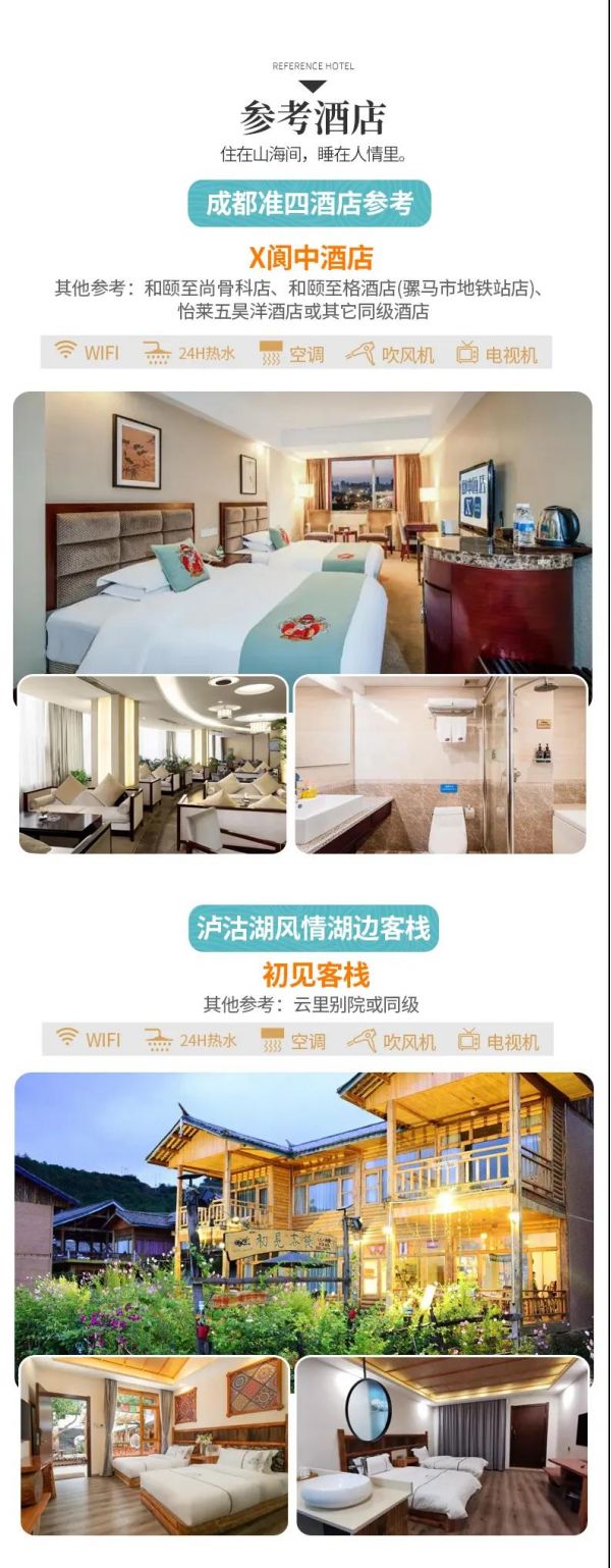 住宿:含全程6晚酒店(含2晚瀘沽湖湖畔風(fēng)情客棧)。參考酒店如下(僅供參考,實(shí)際以訂房為準(zhǔn)):