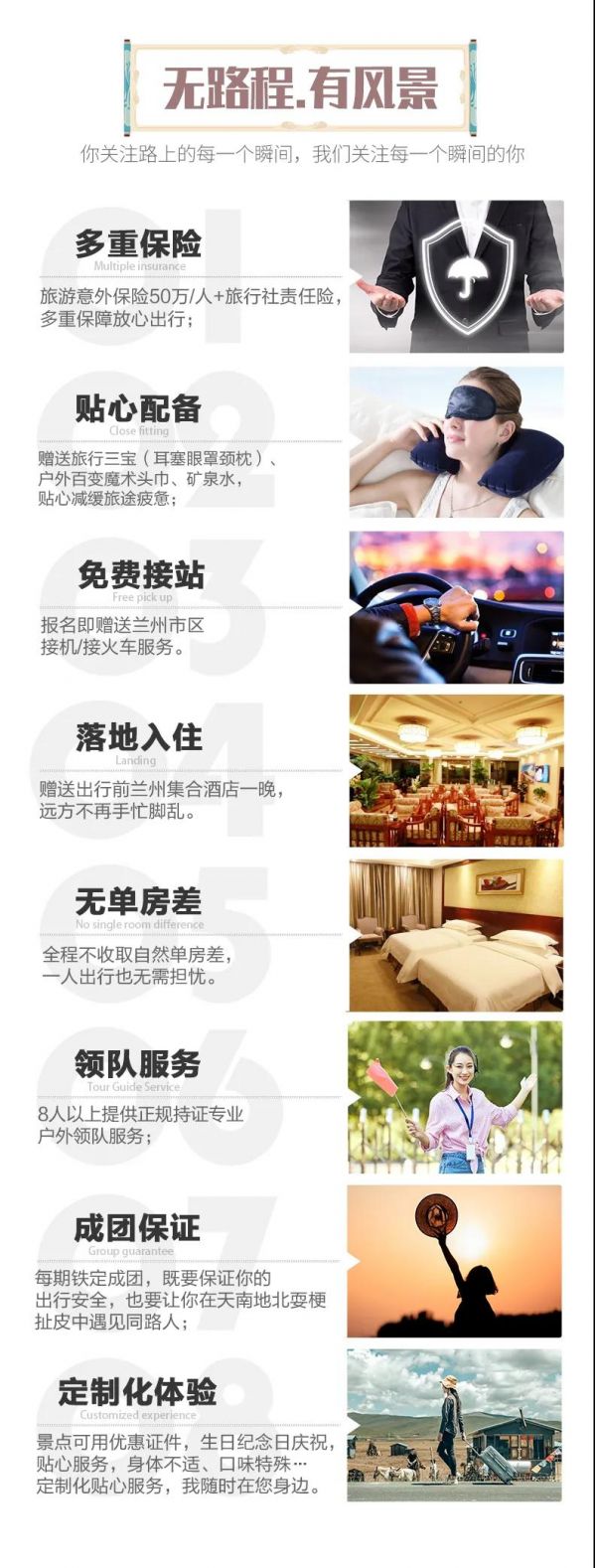 服務(wù):8人以上提供正規(guī)持證專(zhuān)業(yè)戶(hù)外領(lǐng)隊(duì)服務(wù);8人及以下由經(jīng)驗(yàn)豐富的司機(jī)提供向?qū)Х?wù)。保險(xiǎn)贈(zèng)送旅游意外保險(xiǎn),旅游意外保險(xiǎn)最高賠付50萬(wàn)元/人(外賓另議),購(gòu)買(mǎi)旅行社責(zé)任險(xiǎn);保險(xiǎn)不含財(cái)產(chǎn)險(xiǎn),請(qǐng)游客保管好自己的財(cái)物;因旅行意外造成的客人意外傷害,按保險(xiǎn)公司規(guī)定賠償,我方不承擔(dān)另外的賠償責(zé)任;如游客有需要可自行購(gòu)買(mǎi)其他保障險(xiǎn)。