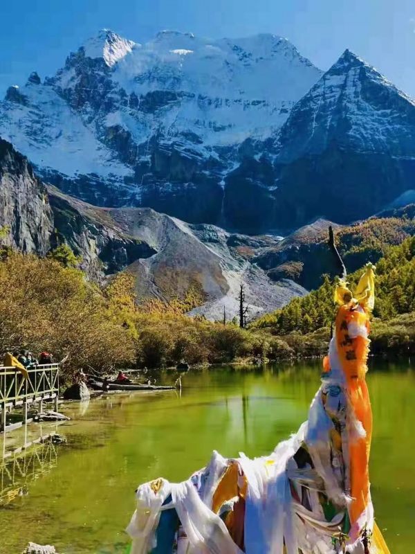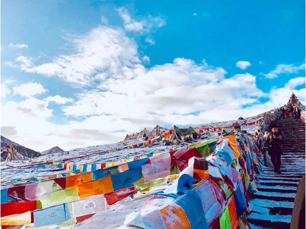 它是地理分界線,以西就是青藏高原東部,真正的藏區(qū)。山上常年有白雪,天幽藍(lán),經(jīng)幡被風(fēng)吹的唰唰作響。