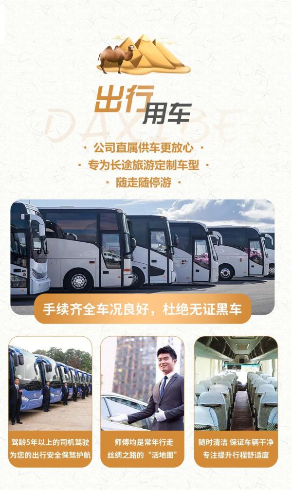 交通:全程正規(guī)空調(diào)旅游車出行,保證一人一正座位,車型大小根據(jù)實際人數(shù)安排,且由駕駛經(jīng)驗豐富的司機為您的出行保駕護航,報價包含車費、油費、停車費、維修費及司機勞務費。