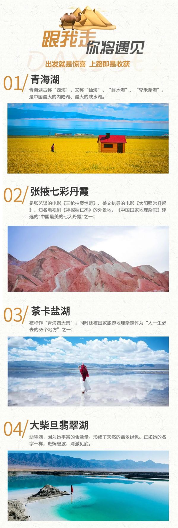 丹霞地質(zhì)公園+嘉峪關+敦煌+莫高窟+鳴沙山月牙泉+阿克塞石油小鎮(zhèn)+大柴旦翡翠湖+柴達木盆地+茶卡鹽湖+青海湖二郎劍景區(qū)+塔爾寺