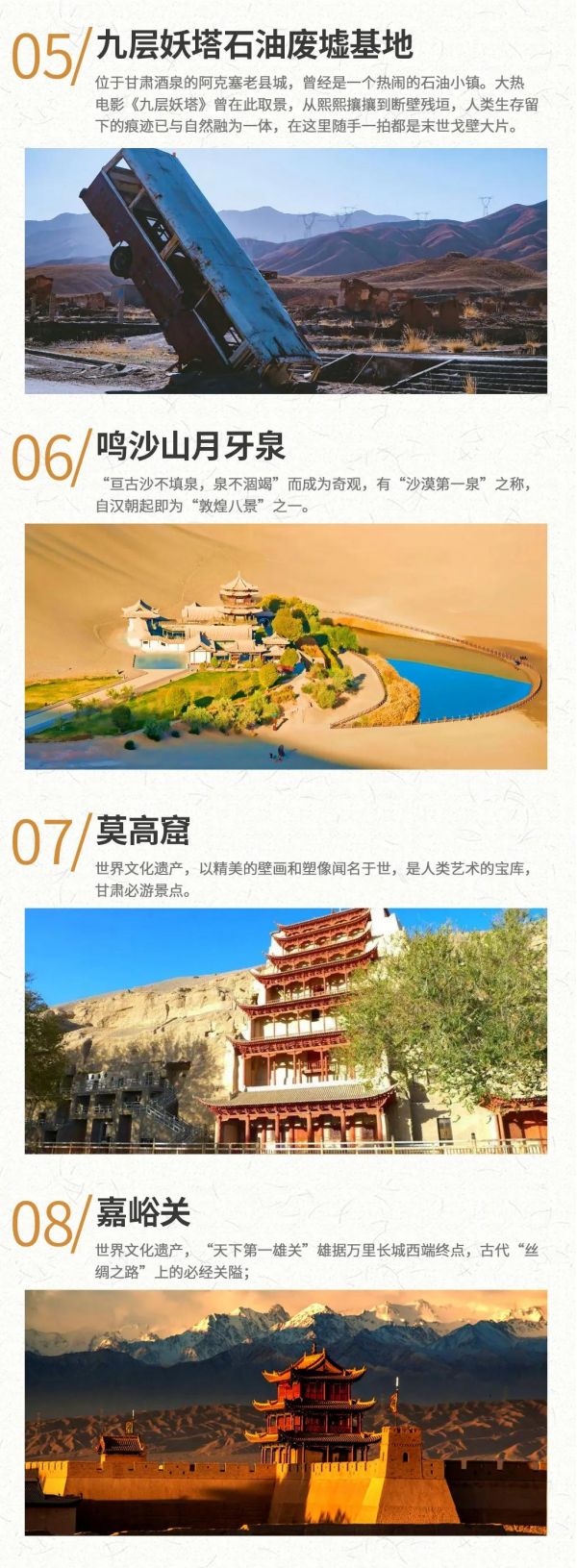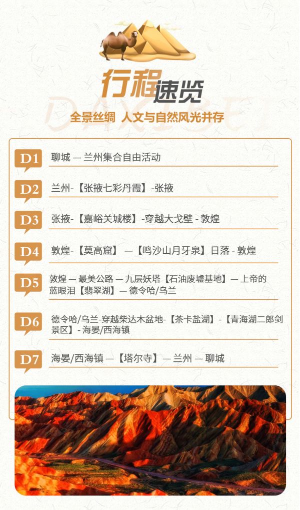 1. 敦煌莫高窟景區(qū)自2015年6月起實行數(shù)字展示中心數(shù)字洞窟展示和莫高窟實體洞窟體驗的預約參觀模式,每天限6000人參觀,團隊參觀時間嚴格按照莫高窟預約場次進行,因此,敦煌段景點參觀順序會根據(jù)莫高窟時間進行調(diào)整或同團客人安排不同時間游覽,敬請配合。