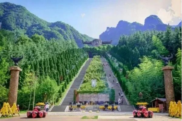 神農(nóng)壇分天、地二壇,依山而建。天壇正中聳立著炎帝神農(nóng)巨型牛首人身雕像。天壇之下為地壇,辟有可容數(shù)千人之眾的廣場(chǎng)。廣場(chǎng)大圓圖案,代表天;圓心處設(shè)正方形,代表地,方形圖案中,五彩石分列表示木、火、土、金、水五行。