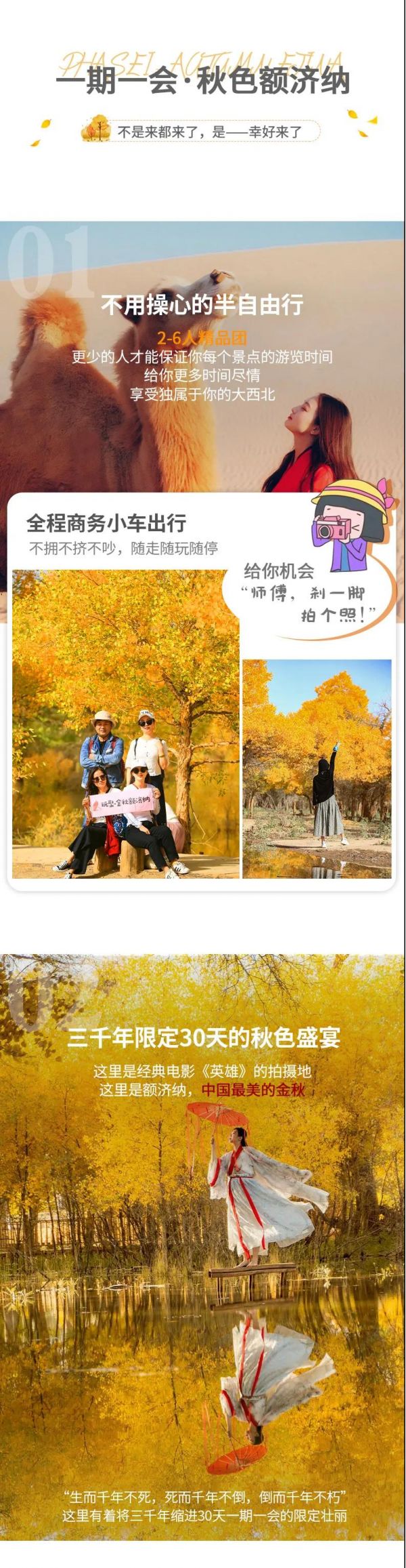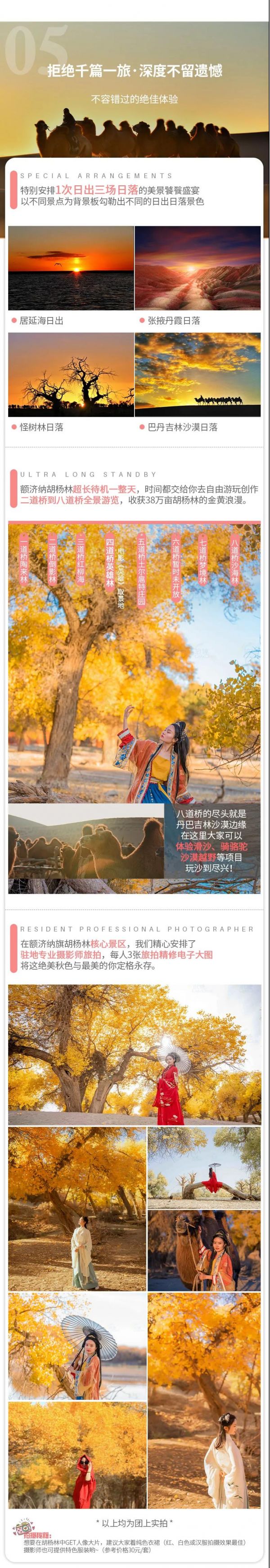 在額濟(jì)納旗胡楊林核心景區(qū),我們還精心安排了駐地專業(yè)攝影師旅拍,每人至少3張旅拍精修電子大圖,將這絕美秋色與最美的你定格永存。