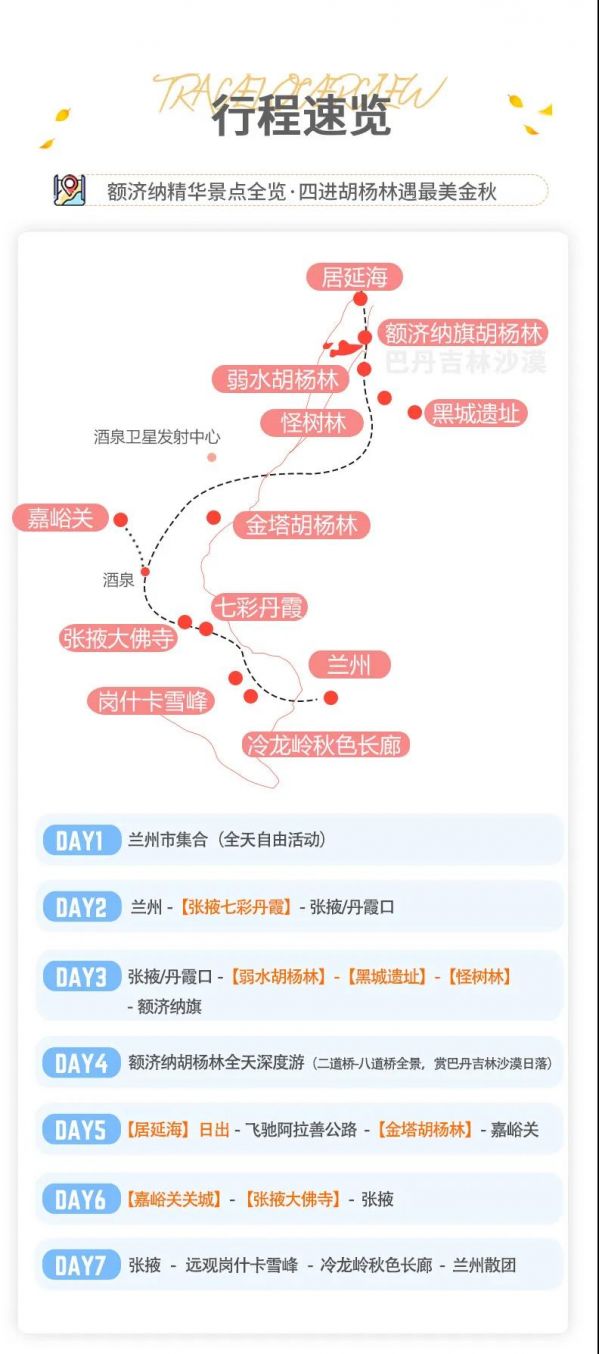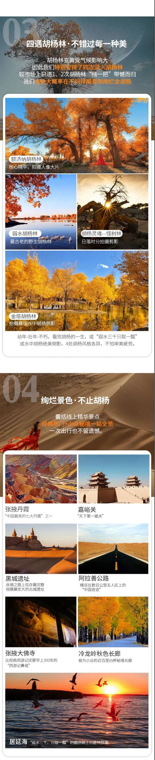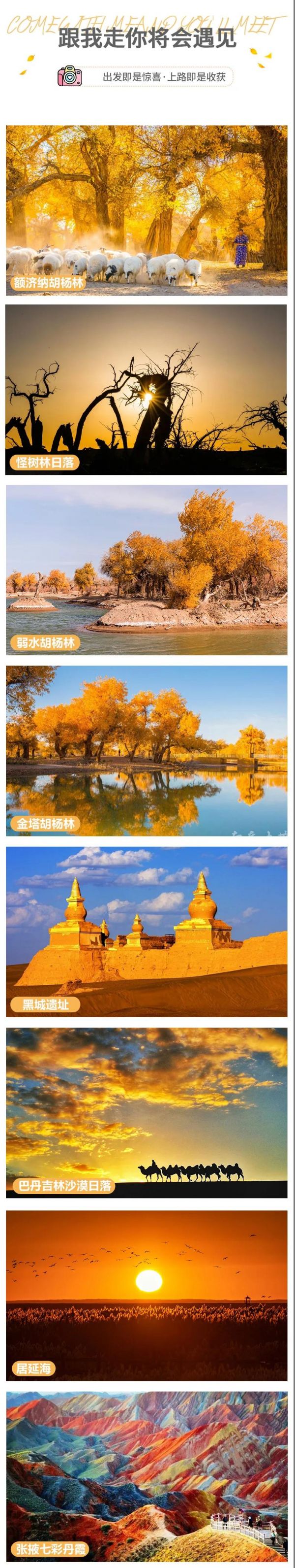 額濟(jì)納胡楊林+冷龍嶺秋色長廊+金塔胡楊林+弱水胡楊林+怪樹林+七彩丹霞+居延海日出+沙漠日落+張掖大佛寺+嘉峪關(guān)城樓+阿拉善公路+黑城遺址