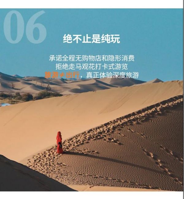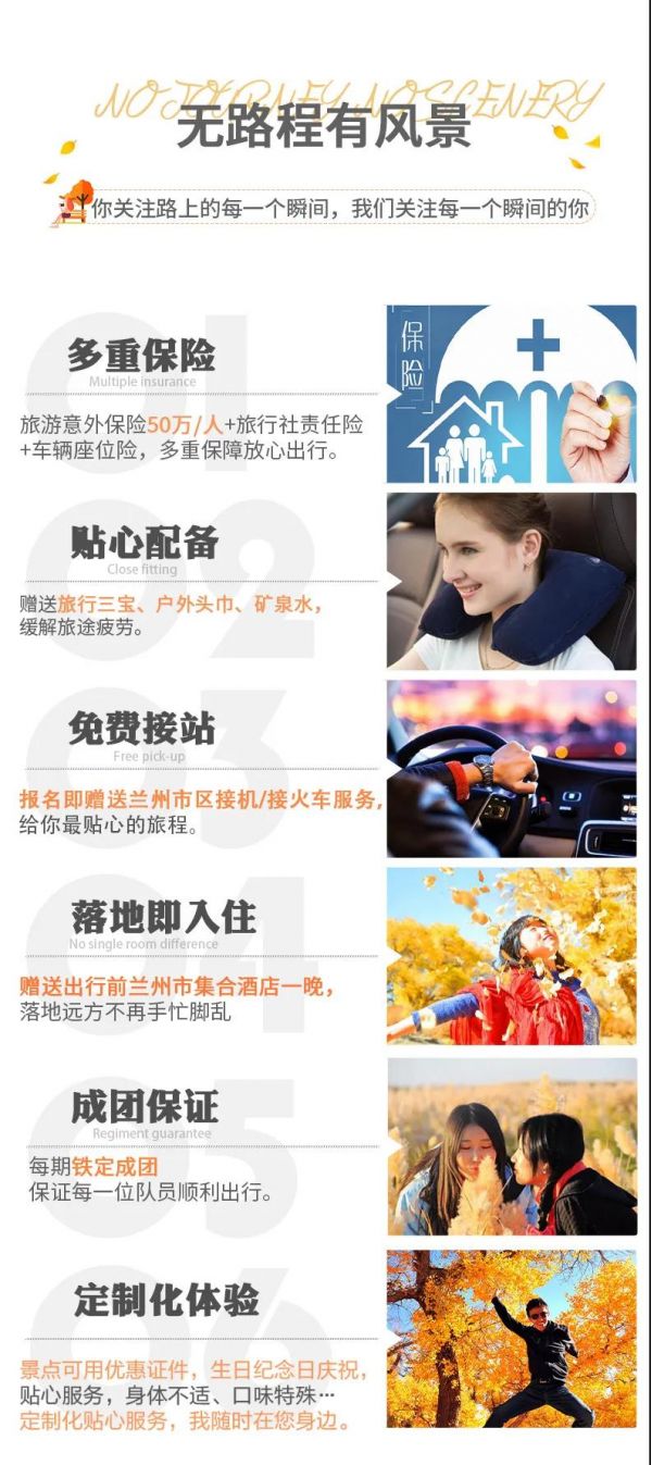 3、贈送:貼心禮包戶外百變魔術(shù)頭巾防曬防沙+旅游三寶緩解乘車疲勞+每人每天一瓶礦泉水;贈送蘭州市區(qū)接機(jī)/接火車服務(wù)(23點后由于運(yùn)管規(guī)定不能接機(jī)/接站);項目不用不退,望您諒解。