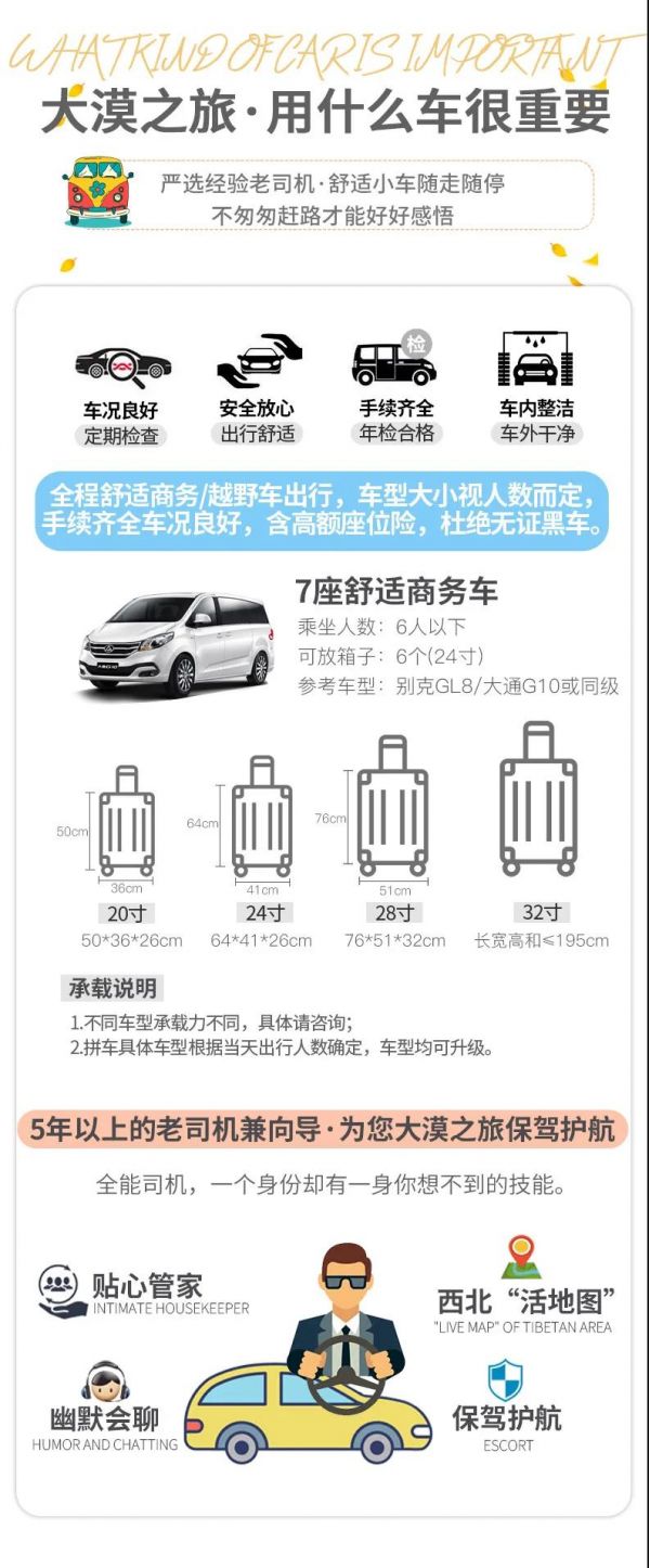 1、交通:2-6人VIP私享小團(tuán),全程舒適商務(wù)車出行,保證一人一正座位,且由駕駛經(jīng)驗豐富的司機(jī)為您的出行保駕護(hù)航,報價包含車費、油費、停車費、維修費及司機(jī)勞務(wù)費。