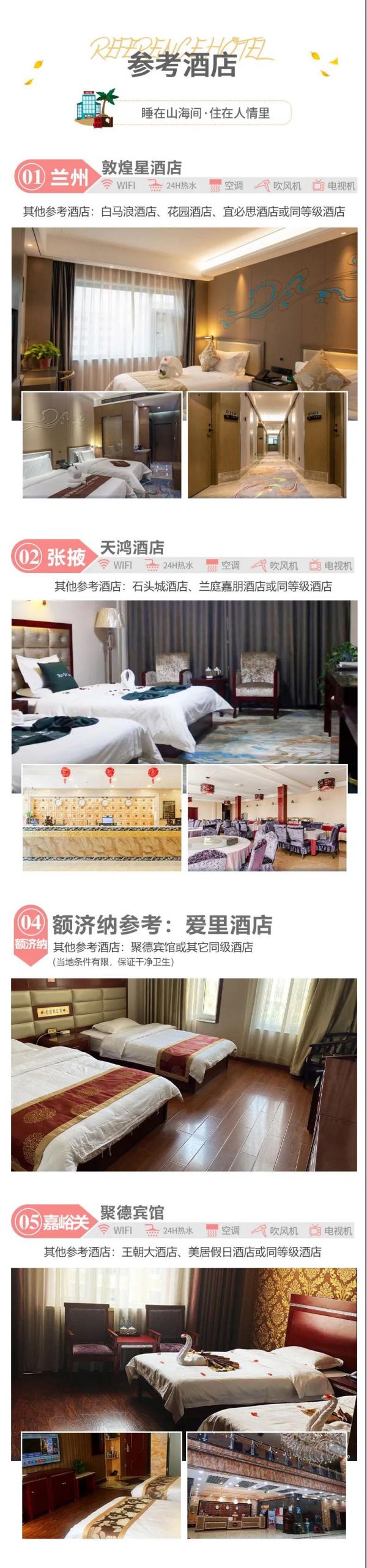 l 張掖/丹霞口酒店:天鴻酒店、崇文酒店、石頭城酒店、蘭庭嘉朋酒店或同等級酒店