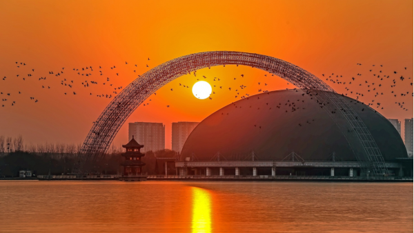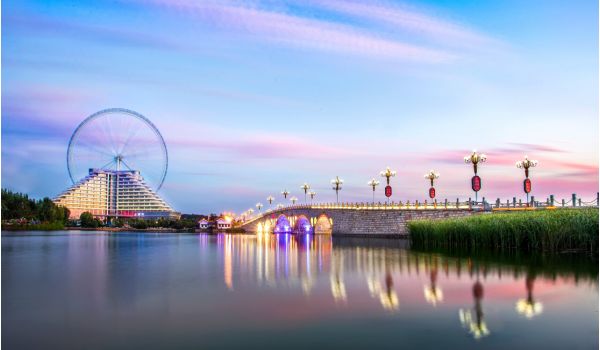 聊城地標(biāo)摩天輪位于東昌湖南岸,總建筑面積約8萬平方米,地下一層,地上13層,共14層,總高130米。摩天輪直徑110米,最低點(diǎn)距地面20米,頂端高度可達(dá)130米,是中國唯一一座輪盤直徑110米斜拉索式的摩天輪,摩天輪共安裝吊箱42個,吊箱呈圓柱形,每個吊箱可乘坐6人,摩天輪共可攜載252人,其中多項(xiàng)技術(shù)與安裝工藝都是全國乃至世界首創(chuàng)。聊城地標(biāo)摩天輪將國際學(xué)術(shù)交流中心和巨大的摩天輪融為一體,這種建筑造型在全國乃至世界范圍內(nèi)都是獨(dú)一無二的,是全球首座建筑與摩天輪相結(jié)合的城市地標(biāo)。游客可乘坐摩天輪登到130米高的高空,北望東昌湖,南望鳳凰湖,可一覽水城全貌。