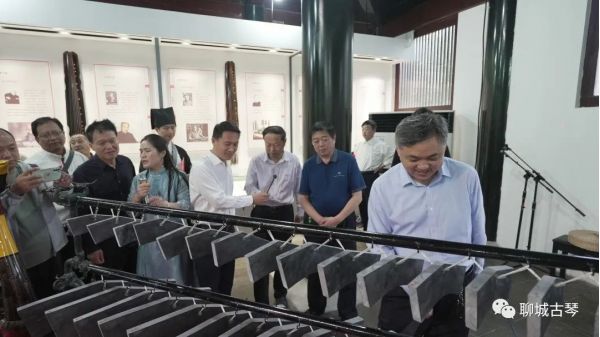領(lǐng)導(dǎo)嘉賓對編鐘編磬“一見鐘情”,紛紛上前,敲響這自2400多年前就響徹華夏的中國聲音!大家在周達老師的引導(dǎo)下,參觀了雅樂琴文化展廳、衣冠華夏廳、古琴非遺傳習(xí)所、書畫創(chuàng)作展示以及斫琴體驗廳等區(qū)域。并且駐足鑒賞園區(qū)內(nèi)每一副牌匾及楹聯(lián),給予高度贊賞! 聊城古琴藝術(shù)館,打造集琴文化展示、斫琴體驗、非遺傳習(xí)、古籍研究、書畫創(chuàng)作于一體的文化新空間,既為廣大古琴愛好者提供一個學(xué)習(xí)展示交流的專業(yè)平臺,又能為市民群眾和外地游客帶來更加直觀的視聽體驗。