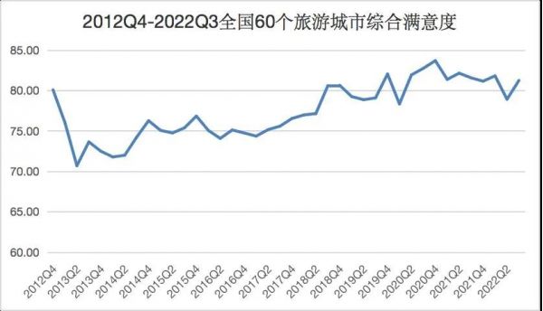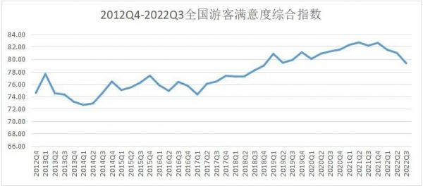 根據(jù)各季度統(tǒng)計(jì)數(shù)據(jù),2012年至2022年游客綜合滿意度指數(shù)從2012年第四季度的74.56提升到2022年第三季度的79.35,其間滿意度最高值出現(xiàn)在2021年第三季度(82.71)。此外,2020年、2021年、2022前三季度游客滿意度分別為80.95、82.47、80.63。